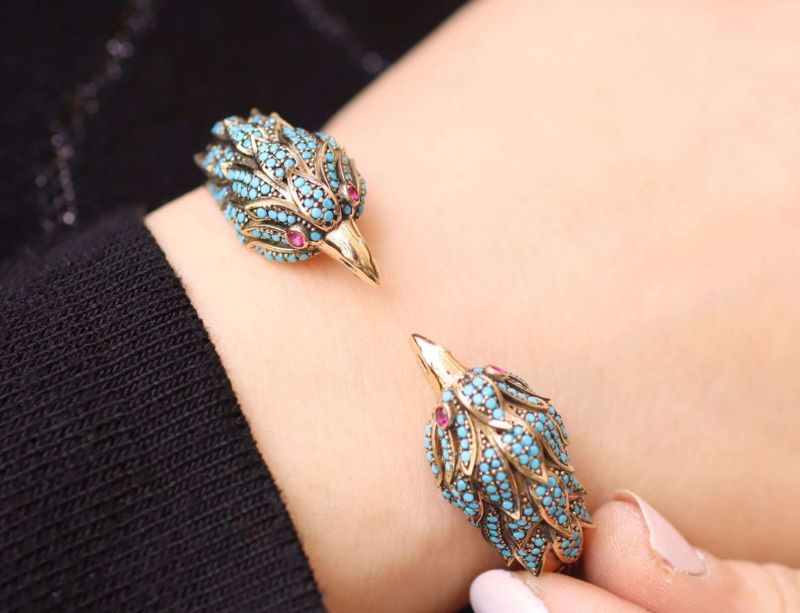 Elevate your jewelry collection with this captivating Animal Birth Cuff Bracelet, handcrafted in premium 925 sterling silver. The design features two intricately detailed bird heads facing each other, symbolizing protection and connection. Adorned with vibrant turquoise gemstones across the body and ruby stones for the eyes, this bangle combines artistry, elegance, and symbolism. Its bold and adjustable fit makes it a standout piece for boho-chic or statement style lovers.