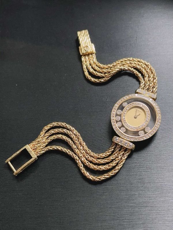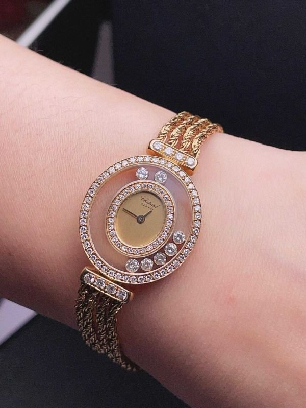 \r\nThis exquisite Chopard vintage timepiece is more than a watch—it\\\'s a legacy. Encased in 18K gold and adorned with lab-grown F/VVS diamonds, every detail exudes refinement and luxury. The graceful pink enamel halo around the dial and the sparkling double halo of diamonds make this a statement of sophistication for the modern woman with timeless taste.